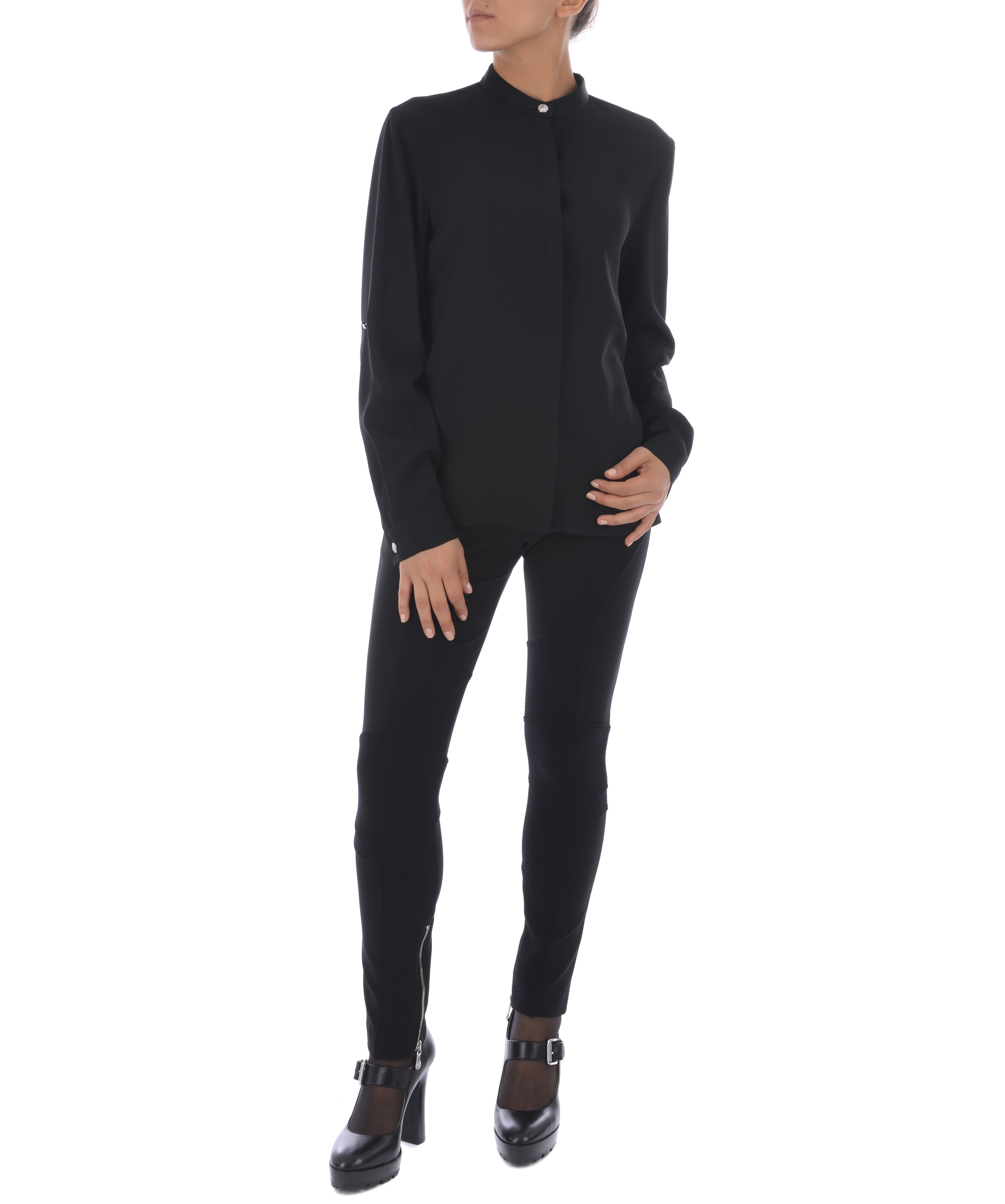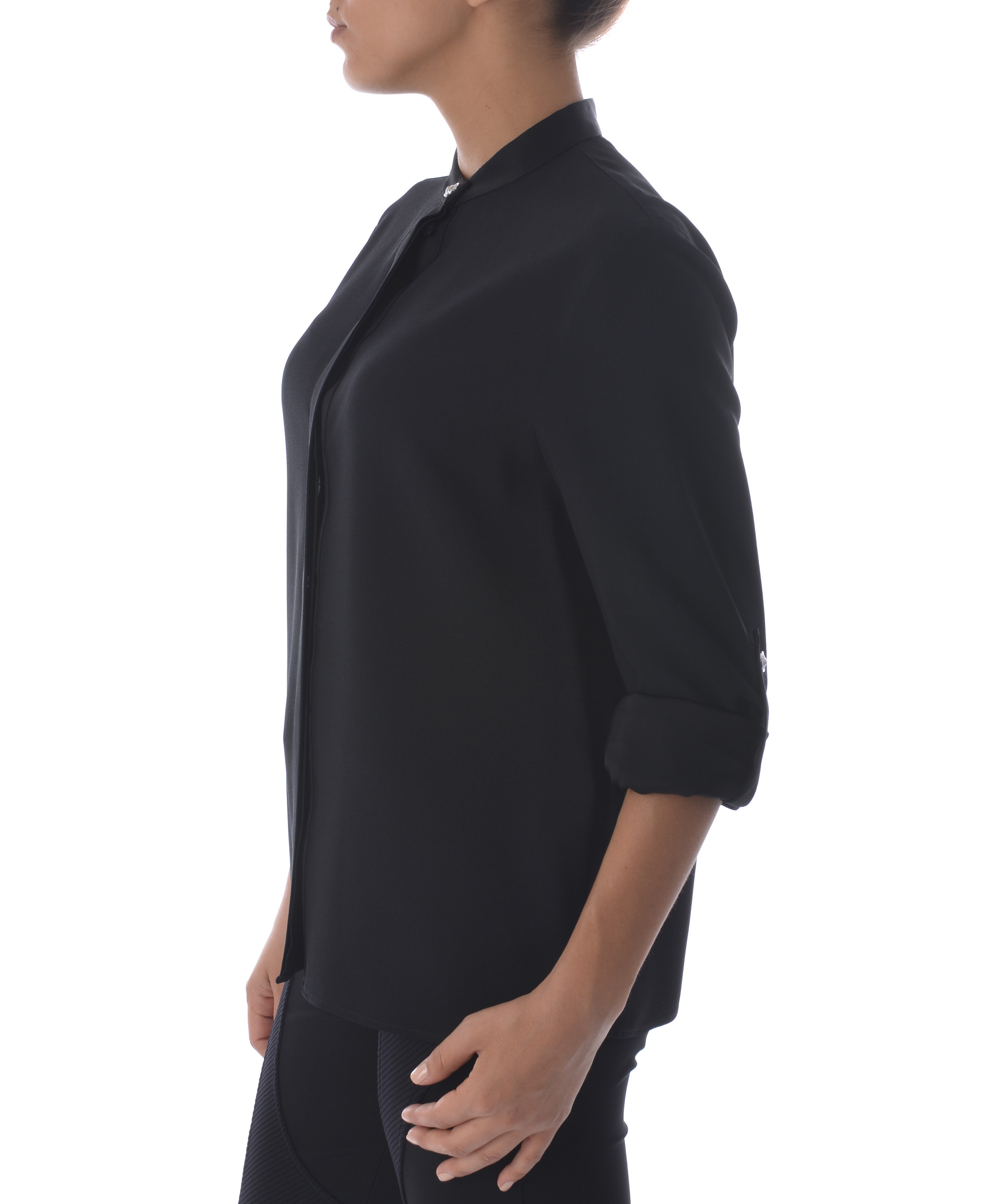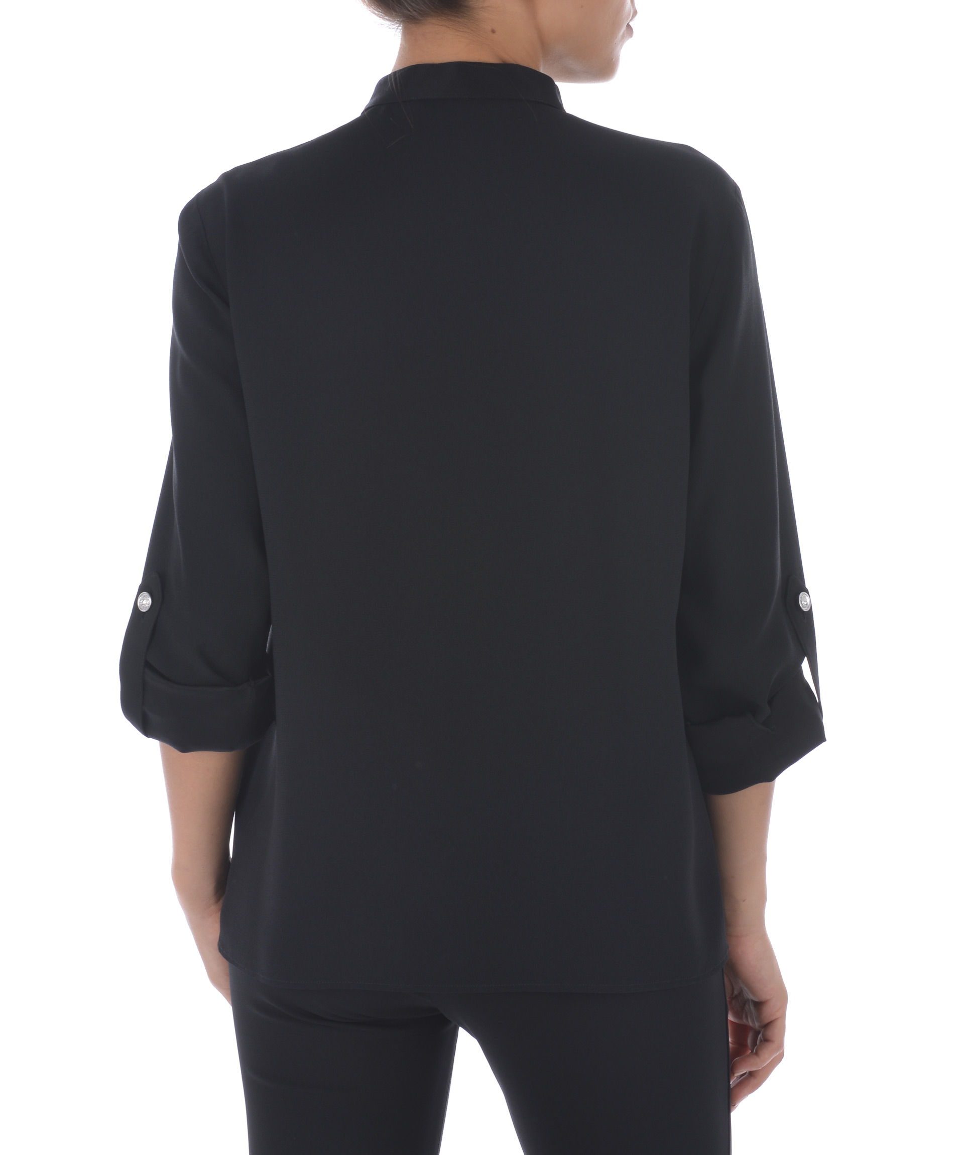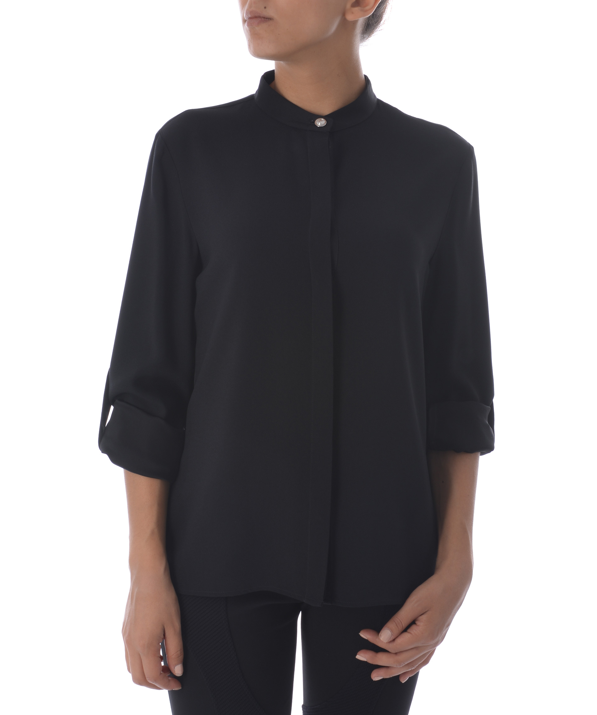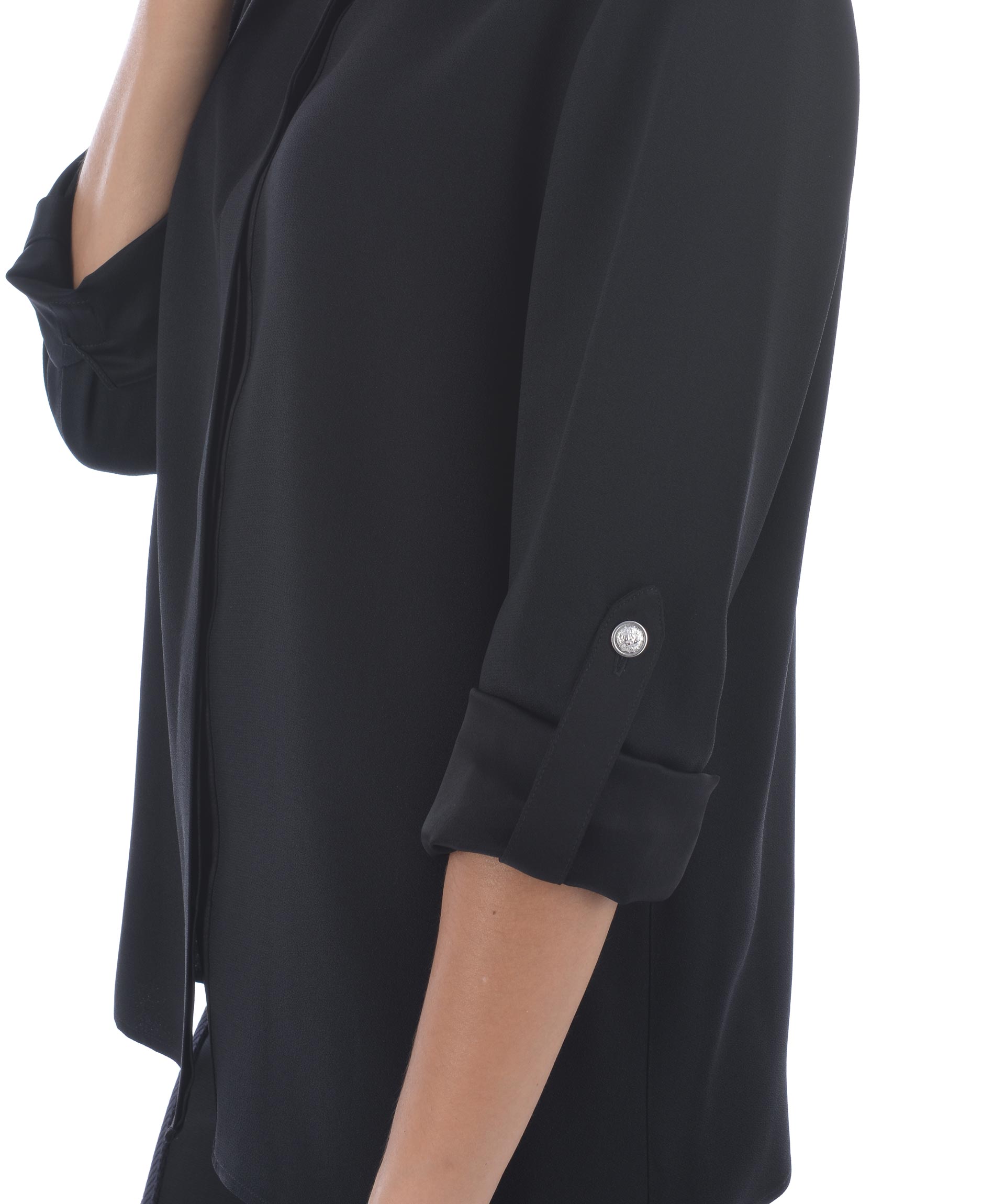 Camicia Versus in crepe Nero. Colletto alla coreana cou bottone logo. Manica lunga accorciabile con bottone logo. Chiusura con bottoni coperta da fintone. Misura in foto 42 70% acetato, 30% viscosa
