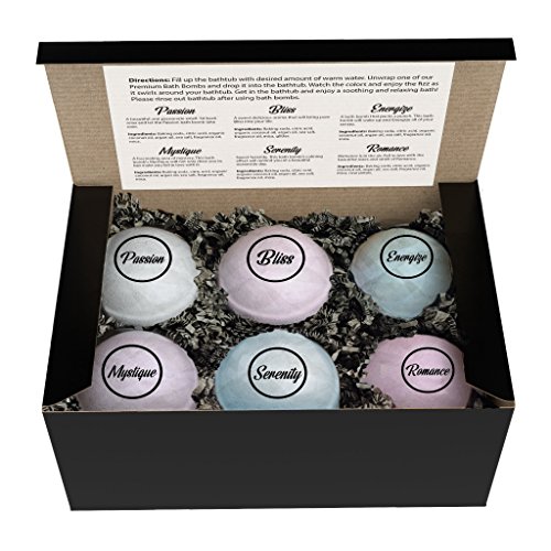 - DOUBLE THE NORMAL SIZE & AMAZING AROMA. This Gift Set Contains Six (6) 4.5 oz Luxurious Bath Bombs (Tennis Ball Size) Which is Twice the Size of the Most Competitors 2.1 oz (Golf Ball Size). Six Unique Fragrances: PASSION, BLISS, ENERGIZE, MYSTIQUE, SERENITY & ROMANCE. Our Bath Bombs Offer a Relaxing & Invigorating Tingling of Your Senses with Unique Fragrances and Vibrant Colors for Every Occasion.