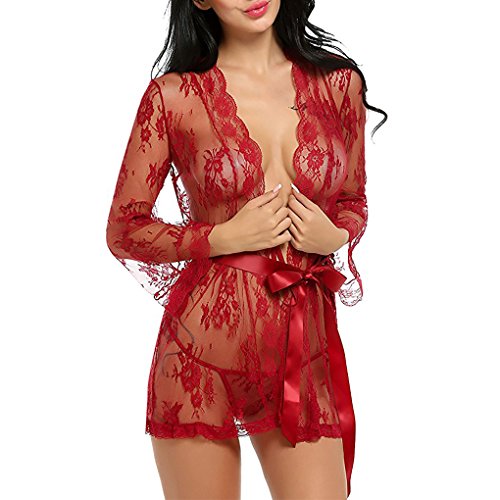 -. Feature : Material --- Nylon, Lace, Satin / Color & Size --- Black, White, Wine, S/M/L/XL/XXL / Design --- Featuring Sheer Lace Kimono with Butterfly Patchwork, This Baby Doll Lingerie is a Scalloped Edge Trim and Satin Tie Sash. / Occasion --- Sexy Mesh See Through Lace Lingerie Which is Elegant and Makes You Stunning and Also You can Wear as a Nightwear. / Package Include --- 1 x Charmiral Sexy Bodysuit Lingerie and 1 x G-String.