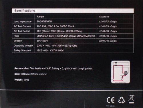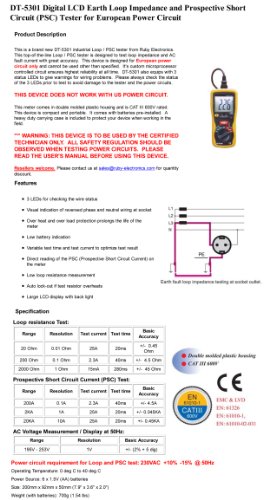 This is a brand new DT-5301 industrial Loop / PSC tester from Ruby Electronics. This top-of-the-line Loop / PSC tester is designed to test loop impedance and AC fault current with great accuracy. This device is designed for European power circuit only and cannot be used other than specified. It's custom microprocessor controlled circuit ensures highest reliability at all time. DT-5301 also equips with 3 status LEDs to give warnings for wiring problems. Please always check the status of the 3 LEDs prior to test to avoid damage to the tester and the power circuits. This device does not work with US power circuit. This meter comes in double molded plastic housing and is CAT III 600V rated. This device is compact and portable. It comes with batteries pre-installed. A heavy duty carrying case is included to protect your device when working in the field. *** Warning: This device is to be used by the certified technician only. All safety regulation should be observed when testing power circuits. Please read the user's manual before using this device.Feature