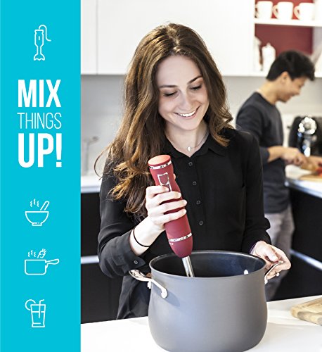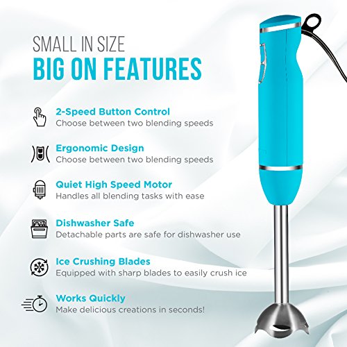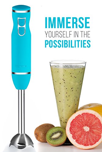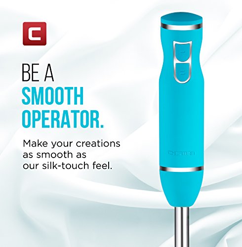 Handle all your blending needs with ease using the Chefman Immersion Blender. Equipped with a powerful 300-Watt ultra-quiet motor, this immersion hand blender quickly purees soups, blends batters, smoothies and more, so you can make delicious creations in seconds. Make your dishes as smooth as our silk-touch feel; the mixers unique blade provides extremely smooth and even blending, while its protective blade guard helps prevent splattering. With a sleek stick design it easily reaches into mixing bowls, large cooking pots, and pitchers so you can blend an array of items conveniently and hassle free. The lightweight design, easy to-grip ergonomic handle, and simple push-button control make this the ultimate tool for a variety of blending needs. Detachable parts are dishwasher safe, making this stick blender as easy to clean as it is to use. Immerse yourself in the possibilities!Feature