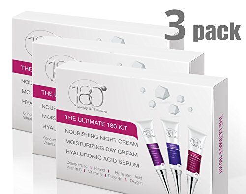 -. Binding : Misc. -. Brand : 180 Cosmetics -. EAN : 7290015196185 -. Feature : GET RID OF VISIBLE WRINKLES AND FINE LINES Our Hyaluronic Serum is an effective line filler and instant wrinkle remover / ENJOY REFRESHED SKIN Our Moisturizing Day Cream will keep you skin hydrated and rejuvenated all day long / INDULGE AND NOURISH YOUR SKIN Our powerful nourishing night cream will vitalize your skin and make it look youthful and radiant! / TREAT YOURSELF TO YOUNGER LOOKING SKIN Our products are enriched with Retinol, Vitamin C, Peptides and Hyaluronic Acid and are made with active ingredients for maximum results - Money Back Guarantee. No Questions Asked / A GREAT GIFT IDEA OR AN ALL AROUND FACIAL PACKAGE! This is the complete beauty set for your daily anti aging treatment! -. IsAdultProduct : 0 -. Label : 180 Cosmetics -. Manufacturer : 180 Cosmetics -. MPN : 7290015196185 -. PartNumber : 7290015196185 -. ProductGroup : Beauty -. ProductTypeName : BEAUTY -. Publisher : 180 Cosmetics -. Studio : 180 Cosmetics -. Title : 180 Cosmetics - SET OF 3 PRODUCTS - The Ultimate Skin Care Kit, Enjoy Younger Looking Skin With This Facial Care Kit for Immediate & Long Term Results. Day Cream, Night Cream and Hyaluronic Acid Serum