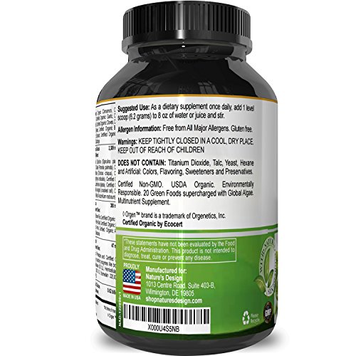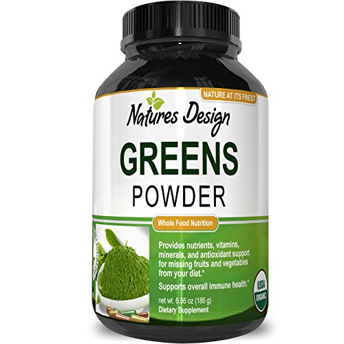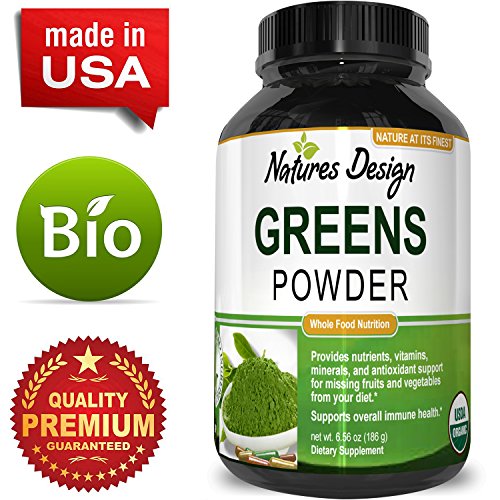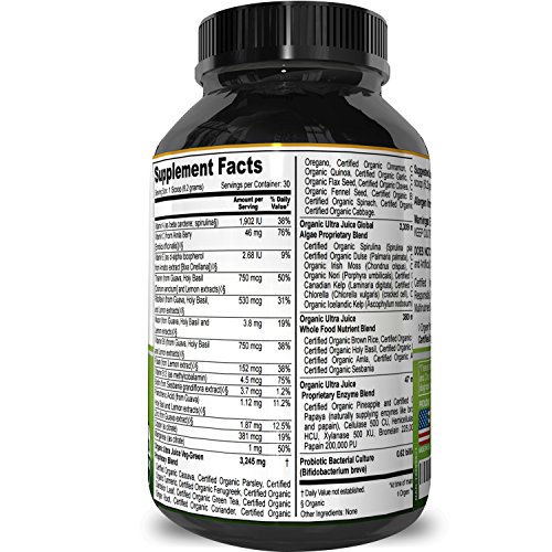 100% CUSTOMER SATISFACTION This premium bottle of natural greens powder is produced in a GMP certified facility. This greens powder contains Organic Maca + Cacao Wheat Grass & Acai. Tons of vitamins and nutrients!