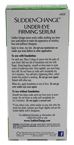 -. Binding : Health and Beauty -. Brand : Sudden Change -. Feature : For delicate eye area, use daytime or evening to look your best! / Results Guaranteed / For a temporary under-eye "lift" whenever you need it / Lasts for hours! -. Label : CCA Industries, Inc. -. Manufacturer : CCA Industries, Inc. -. MPN : 47379 -. PackageQuantity : 1 -. PartNumber : 47379 -. ProductGroup : Health and Beauty -. ProductTypeName : HEALTH_PERSONAL_CARE -. Publisher : CCA Industries, Inc. -. Studio : CCA Industries, Inc. -. Title : SUDDEN CHANGE UNDER EYE FIRMING SERUM Size .23 OZ