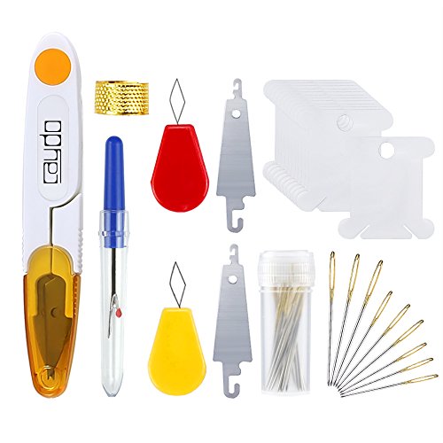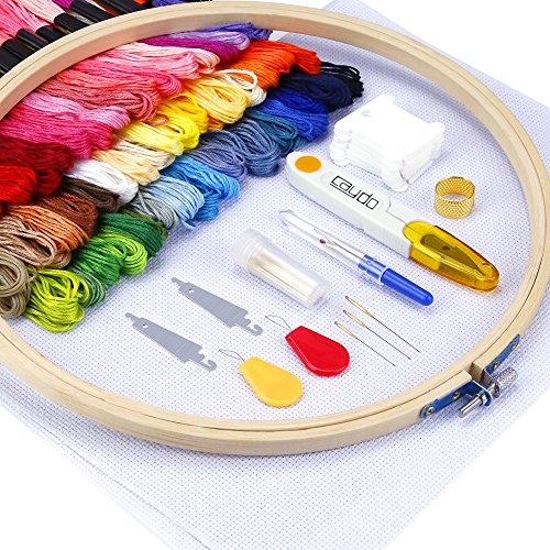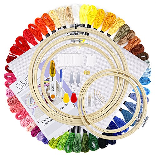 Caydo Full Range of Embroidery Starter Kit Including 5 Pieces Bamboo Embroidery Hoops, 50 Color Threads, 2 Pieces 12 by 18-Inch 14 Count Classic Reserve Aida and Cross Stitch Tool Kit