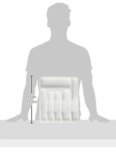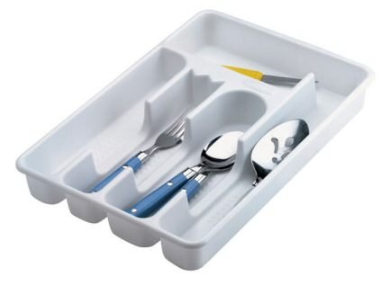 Large white plastic cutlery tray for 5 piece place settings. Includes separate compartments for knives, forks, spoons, and extra utensils. A great way to keep your kitchen and utensils organized for your house. Includes built-in micro ban antimicrobial product protection that fights the growth of stain and odor-causing bacteria, leaving your sink rack smelling fresh and clean.