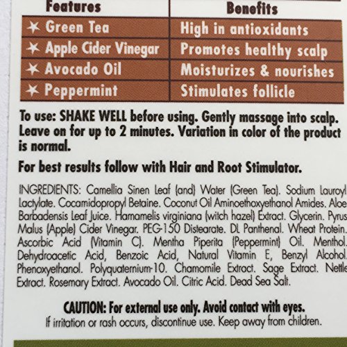-. Feature : For thinning hair and sensitive scalp. Improves and helps to maintain the health of the hair follicles and scalp with most benefitial natural ingredients. Color safe / Stimulates hair follicles for thicker, healthier hair growth. Natural anti-inflammatory ingredients help with dry, itchy, sensitive scalp. pH Balanced / Recommended to be used with Hair & Root Stimulator for best results. Please read the Product Description, Directions sections, and ingredients list in case your are allergic (Numerous herbs are present). The shampoo might be different from what you are used to. Depending on your hair type you can also add our light leave-in or regular conditioner. / Professionally formulated to ensure the highest quality and potency. Not tested on animals. Made in USA. Fresh, natural smell, no fragrance added. / No harsh or harmful chemicals, no silicones, parabens, sulfates. For men and women.