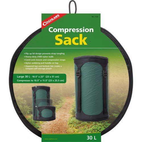 Studio : Jensen Distribution Services Publisher : Jensen Distribution Services Binding : Misc. Product Description Carry more gear in smaller space with the help of the Coghlans 30 Liter Compression Sack. This durable nylon sack is finished with adjustable buckles for easy compression. Dimensions: 10.5W x 11.75D x 1.75H in.. Durable nylon construction. Zipper closure on top and bottom. Adjustable compression straps on sides. 30 liter capacity. Saves space by compressing sleeping bags and equipment. 0