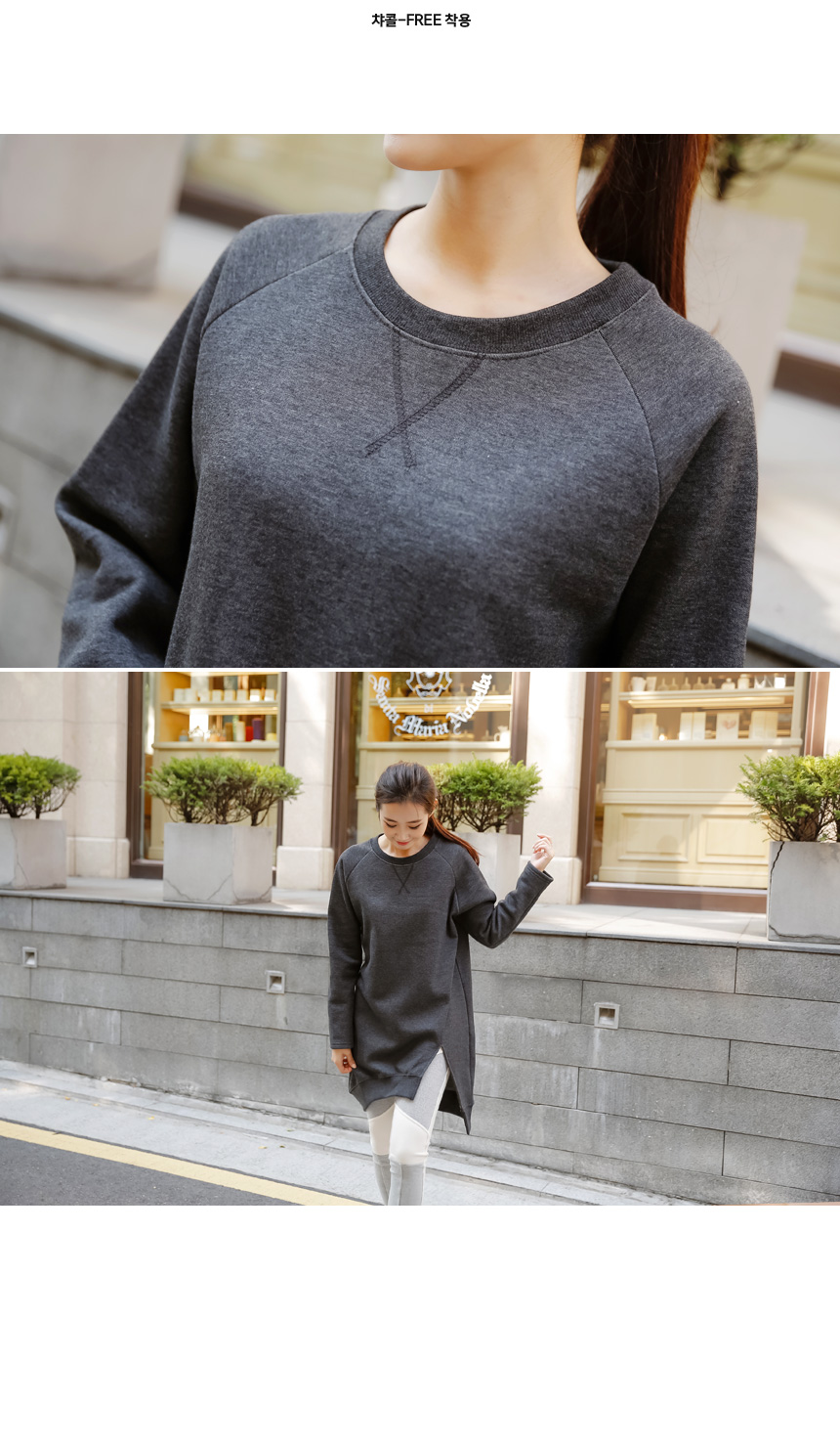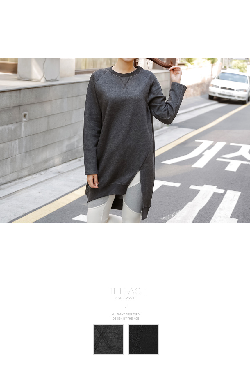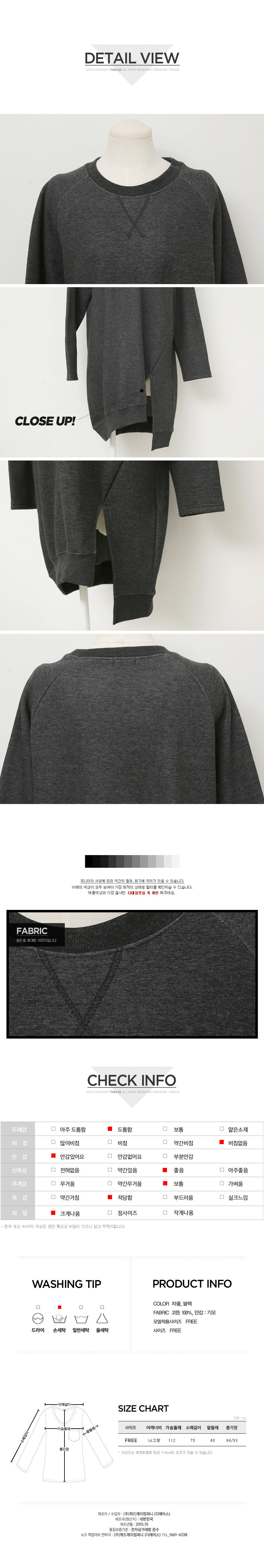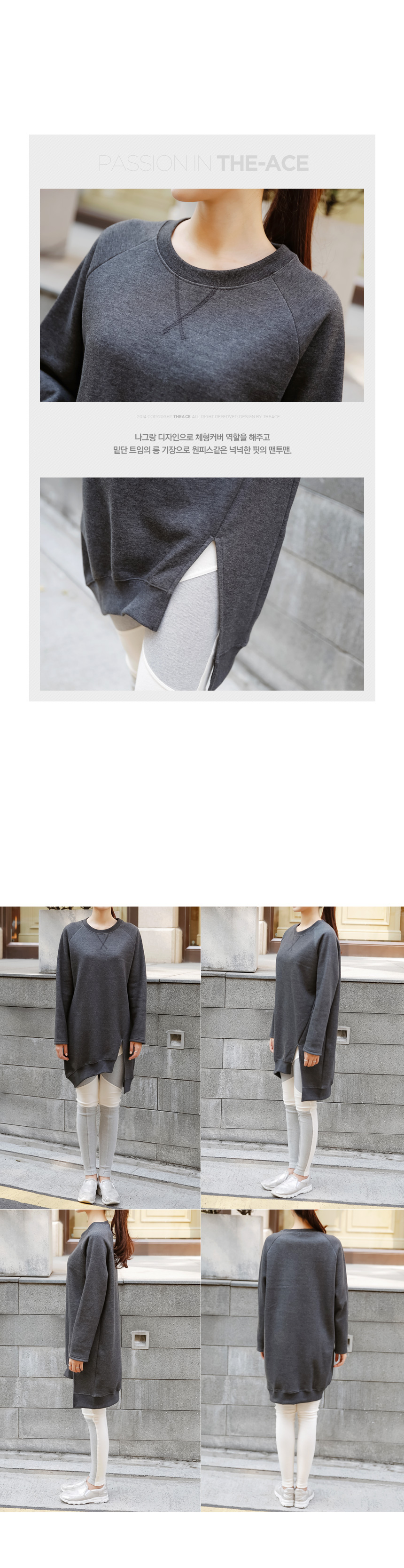 1. 안감 기모로 보온성이 높고, 전면의 언발란스 기장으로 캐주얼하면서 넉넉한 기장의 자체제작 롱 맨투맨