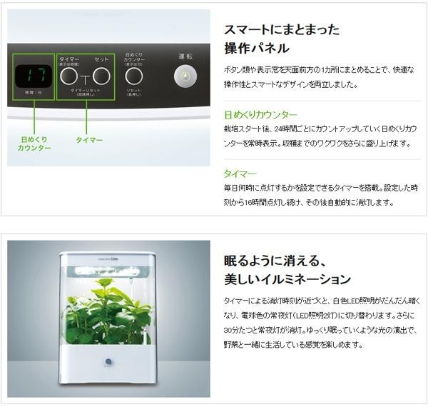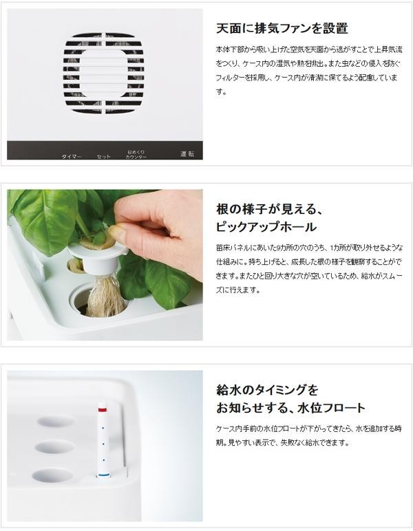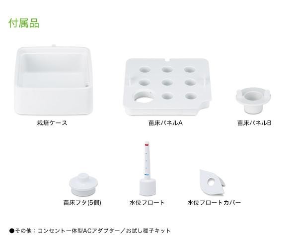 | セット内容 | 本体、栽培ケース、苗床パネルA・B、苗床フタ(5個)、水位フロート、フロートカバー、コンセント一体型ACアダプター、お試し種子キット引き換えハガキ、取扱説明書、保証書(保証期間1年) |