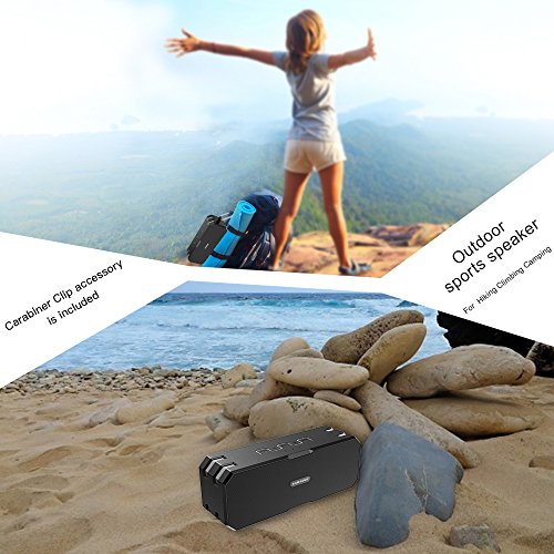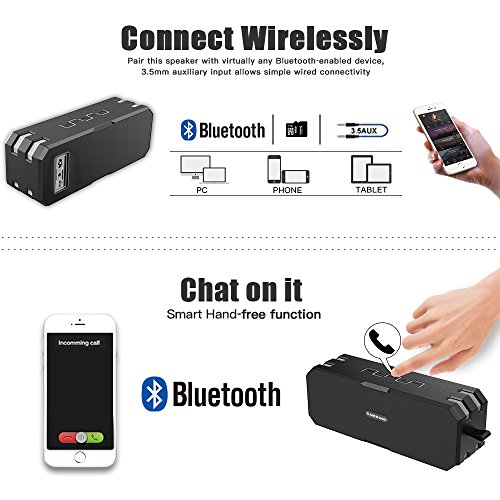 -. Feature : 【IP67 Waterproof】IP67 rating means that this speaker is fully waterproof as well so you can use it in the shower or take it to the pool or beach without having to worry about water damage. With a rubberized coating makes it shockproof and dustproof, perfect portable speaker for shower, party or other outdoor activities like cycling, hiking, travel etc. / 【Advanced Bass】With two 10W High-performance drivers and a unique enhanced bass. Less than 1% total harmonic distortion ensures enhanced clarity and fidelity, Distinct mids and highs from our two precision acoustic drivers delivers excellent stereo sound and enhanced bass from our proP.R.Ietary passive bass radiator design / 【Easy Connection】3 ways to use the waterproof speaker, it can be connected to your device using the auxiliary port; or by using Bluetooth connection; when you don't want to bring your phone, just let it play music with a TF card,the wireless speakers support up to 32GB TF card / 【5200mAh Battery】About 15-hour playtime from the high-capacity built-in 5200mAh lithium-ion battery, keeps your music playing all day and non-stop, the playtime varies according to volume level and audio content, the outdoor speaker needs about 2-3 hours to charge / 【Bluetooth 4.0】Advanced Bluetooth tech offers an extended 66ft range (outside without obstacles); Compatible with iPhone, iPad, iPod, Mac, Smartphones, Tablets etc., built-in Microphone for handsfree calling from Smartphones and iPhones. We offer worry-free 12-month warranty and friendly customer service,which make your purchase absolutely risk-free and you can enjoy testing out it's quality and durability!