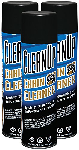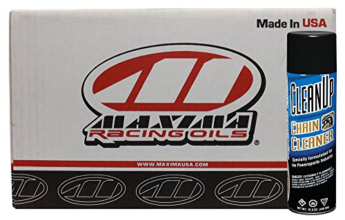Maxima Clean-Up is a heavy duty, emulsion type cleaner designed to thoroughly clean chains without harming rubber O-rings or metal surfaces. Outstanding performance on aluminum. Maxima Clean-Up quickly dissolves and removes hard to clean build up on your chains. Stop robbing horsepower. For best results, use Maxima Clean Up with your routine maintenance. Clean Up's handy aerosol container allows you to spray it on, allow it to set for a minute and then thoroughly rinse it and the dirt away with a hard stream of water. CAUTION: May cause some painted surfaces to discolor. Do Not use on clear plastic or Lexan windshields. Flammable.