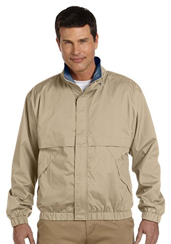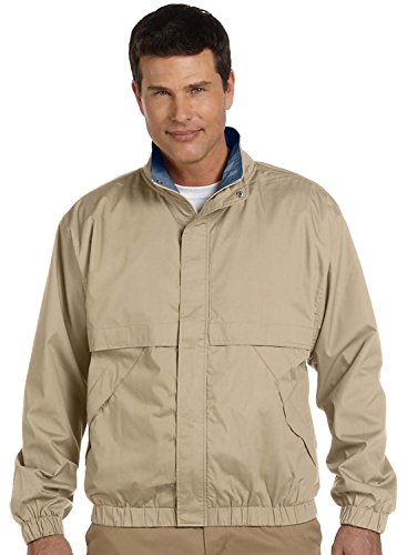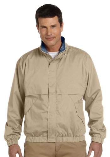 Binding : Apparel Product Description 65% polyester, 35% cotton shell; breathable mesh lining; yoke vents allow air movement and easy embroidery access; elastic cuffs and waist; self-locking outside pockets; inside zip pocket; windguard-covered front-zipper. 0