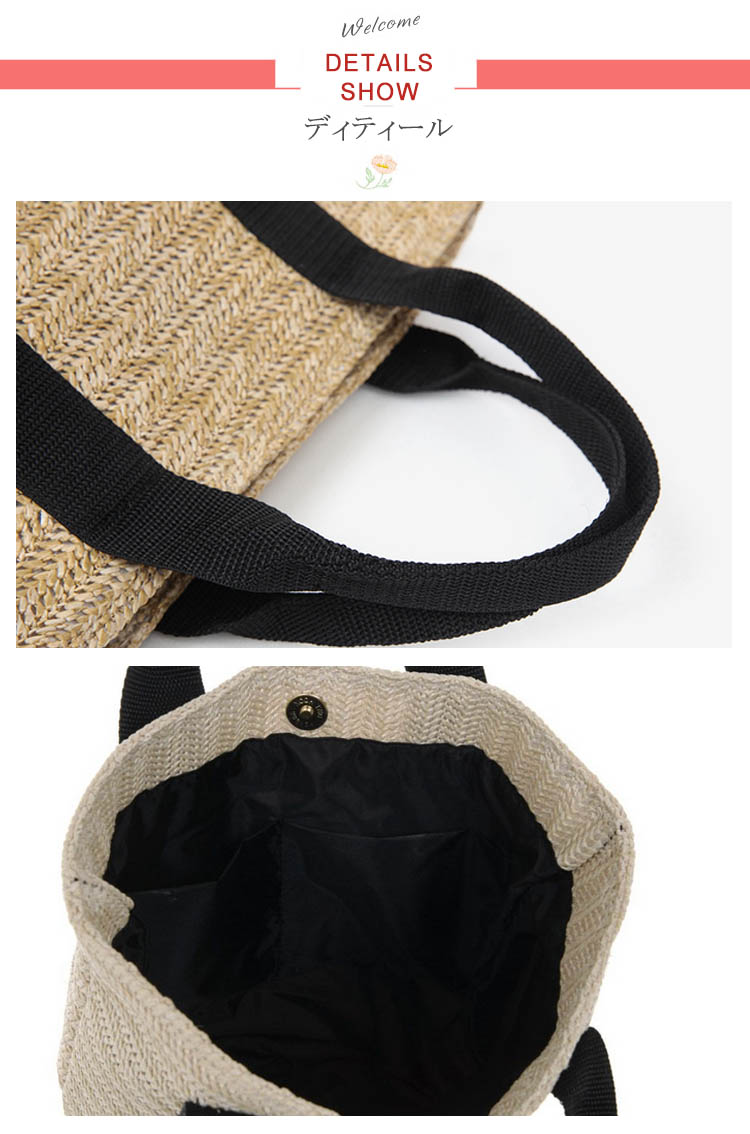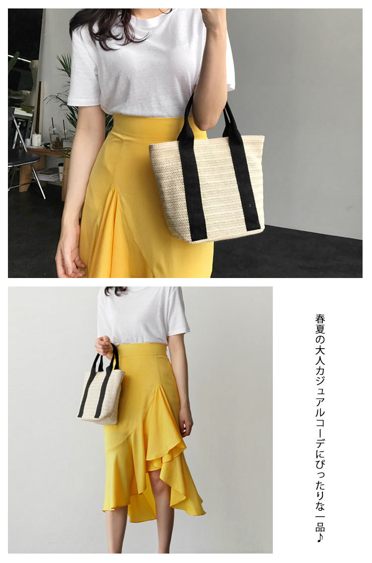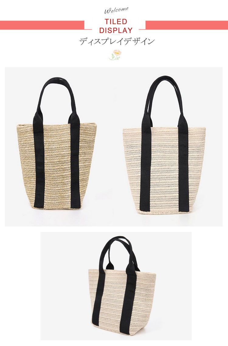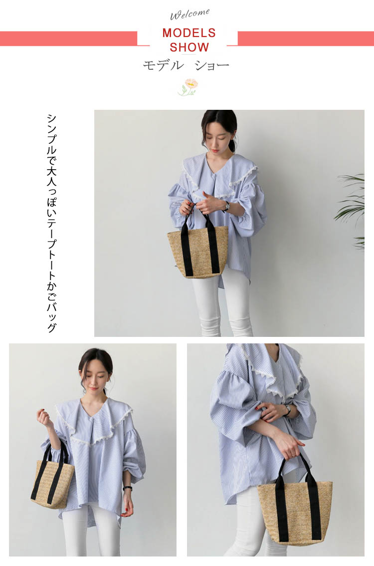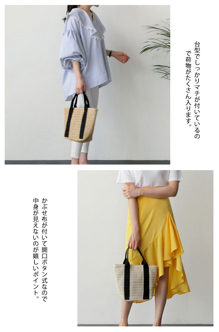 | シンプルで大人っぽいテープトートかごバッグ台型でしっかりマチが付いているので荷物がたくさん入ります。かぶせ布が付いて開口ボタン式なので中身が見えないのが嬉しいポイント。春夏の大人カジュアルコーデにぴったりな一品♪ | |