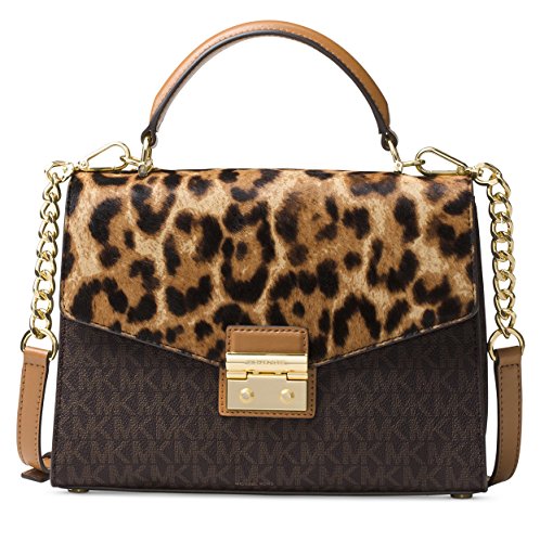 -. Brand : MICHAEL -. Color : Butterscotch/Brown -. Department : womens -. EAN : 0191262358319 -. Feature : Brown MK logo PVC leather w/ genuine calf hair in a leopard P.R.Int. / Logo push-lock flap closure. Golden hardware. Logo-P.R.Int lining. / 4" top handle drop; 19.5" optional, adjustable shoulder strap drop. / Interior zip and large wall pocket. Back magnetic-snap slip pocket. / 9.3"(L) x 7"(H) x 2.75"(W). Structured silhouette with flat base and protective metal feet for stability -. ProductGroup : Shoes -. ProductTypeName : HANDBAG -. Size : Medium -. Title : MICHAEL Sloan Medium Top-Handle Satchel, Butterscotch/Brown -. UPC : 191262358319