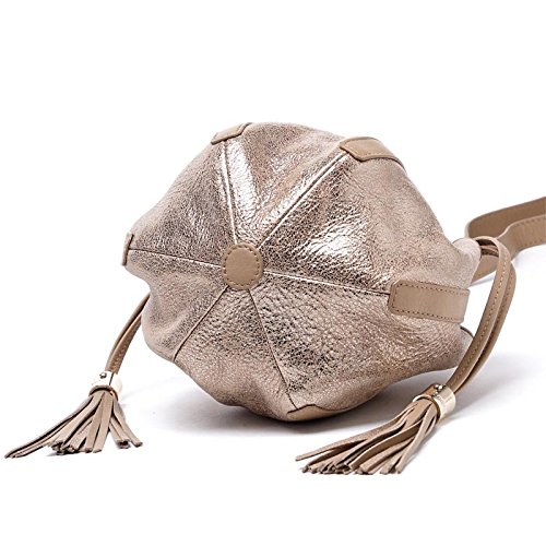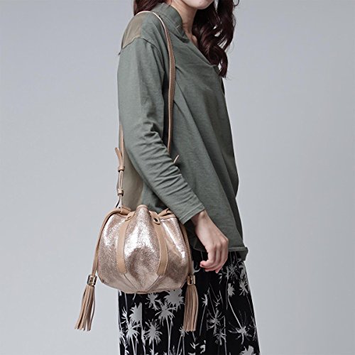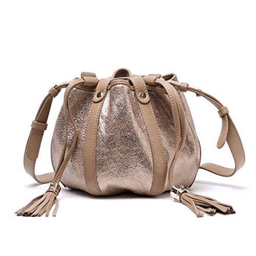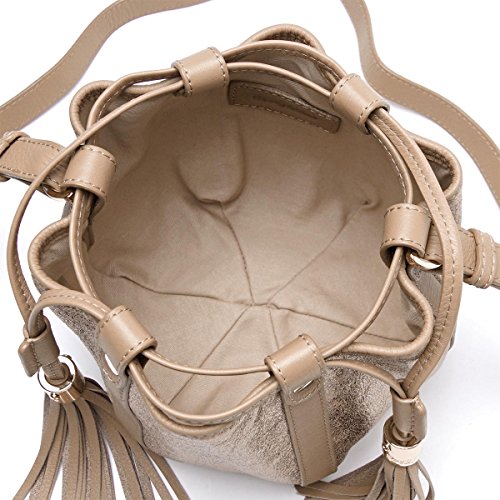 -. Feature : drawstring cinch with tassel detailing / buckled shoulder strap / 8"W x 7"H x 6"D / 20" - 22" crossbody strap drop.