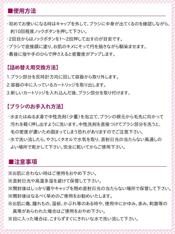 | 肌の毛穴や凹凸をカバーして滑らかにするプライマー入りのファンデーションが登場。0.07mmの人工毛がお顔の凹凸にフィット♪ブラシ一体型にすることで、忙しい朝でも簡単スピーディにメイク。重ねても厚塗りにならず、お肌をきれいにカバーし、ツヤやかさを長時間キープ!ブラシは中性洗剤で洗えるので、いつでも清潔に使えます。日本人の肌質や肌色にこだわりました。 |