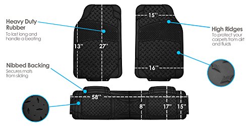 -. Brand : FH Group -. Color : F11307 Black -. Feature : FH Group is a registered brand. For quality goods please ensure you are purchasing from FH Group only, do not fall for imposters. We cannot guarantee merchandise from other sellers to be as pictured and uphold the same quality. / Material: heavy duty vinyl. / Intelligent design combined with trim lines allow for flexible customizations, trimmable with ordinary scissors. Rear piece can be trimmed into 2 separate pieces or kept as one long piece. / Offers all-season protection. Heavy ridged underside prevents shifting and help keep mats securely in place. Durable and heavy-duty vinyl with tall edges and interior channeled area prevent spills and messy cargo from leaking into your original factory mats. Semi customized to fit most sedans, trucks, and SUVs. / Package includes: 3 piece floor mat. Dimensions: Front: 27.5 x 17.8 inches Rear: 58.3 x 14.8 (middle width) x 17 inches -. IsAutographed : 0 -. IsMemorabilia : 0 -. Label : FH Group -. Manufacturer : FH Group -. ManufacturerPartsWarrantyDescription : Parts -. MPN : FH-V16404BEIGE -. PackageQuantity : 1 -. PartNumber : FH-V16404BEIGE -. ProductGroup : Automotive Parts and Accessories -. ProductTypeName : AUTO_ACCESSORY -. Publisher : FH Group -. Studio : FH Group -. Title : FH-F11307 Semi Custom Trimmable Heavy Duty Rubber Floor Mats Front & Rear - Black 3pc Set