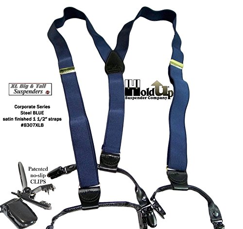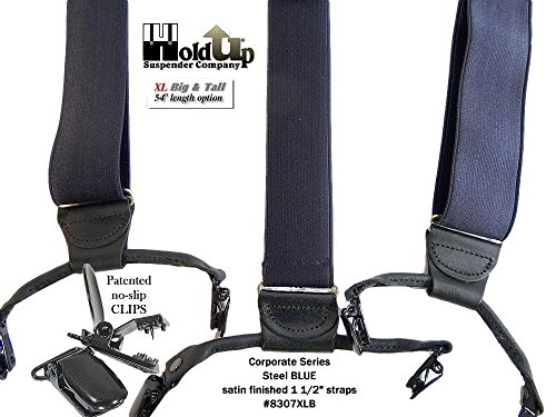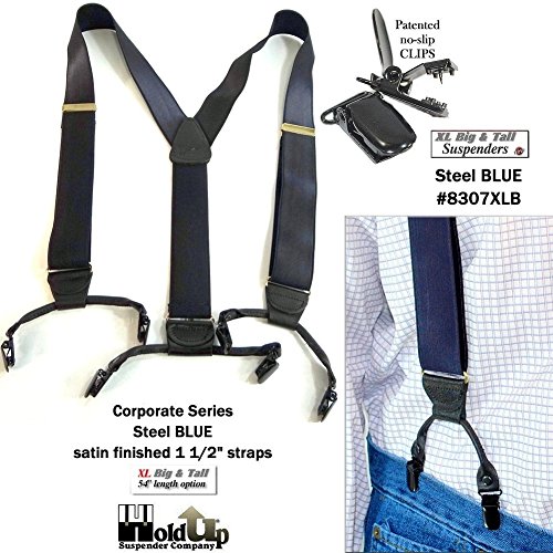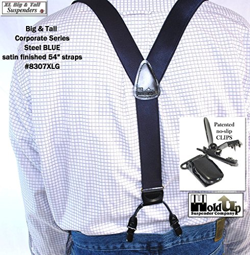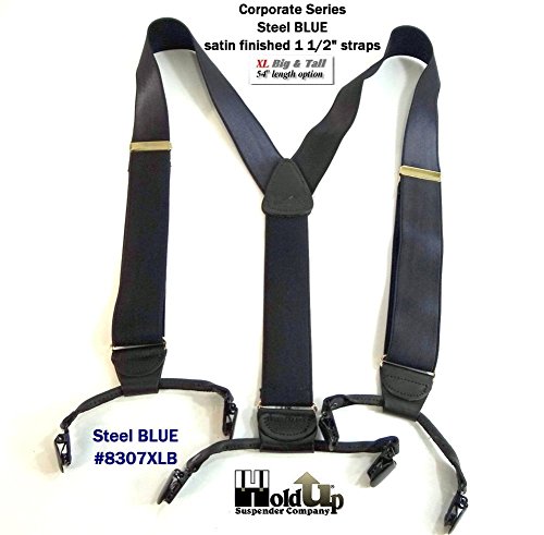 Binding : Apparel Product Description Extra Long Holdup brand Corporate Series satin finished dual clip-on suspenders in a beautiful "Steel Blue" color for the Big Tall man. These are 1 1/2" wide and 54" long (adjustable). This traditional design mirrors the look of "button-on" suspenders worn since they were first invented in the 1800's. Sal Herman, the President of Holdup Suspender Co., worked for years to perfect these SATIN FINISHED Steel Blue stunning braces so popular with media professionals, doctors, businessmen, and professors. By eliminating the custom tailoring requirement to sew suspender buttons onto every pair of pants you wish to wear with suspenders...now you can easily attach your Double-UpsTM to your entire wardrobe of pants in a snap. Get the aesthetic look of "old design button-on" braces with the convenience and ease of our no-slip clips. These are great for office or casual wear when you need to make a conservative fashion statement! Pick out several pair in your favorite colors, which all have top grade black leather tabs and our logo embossed on the doubled stitched crosspatch. Great gift for birthdays, Father's Day or special holidays. All materials are carefully chosen for elastic durability with a fine satin like weave and triple plated gold tone adjuster. If you need a pair of suspenders that perform year after year...then we'd always suggest a pair of Holdup Suspenders for you or a friend. 0