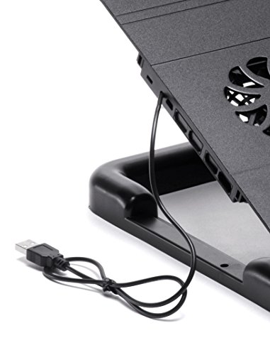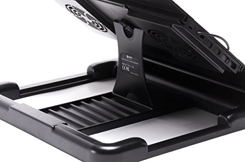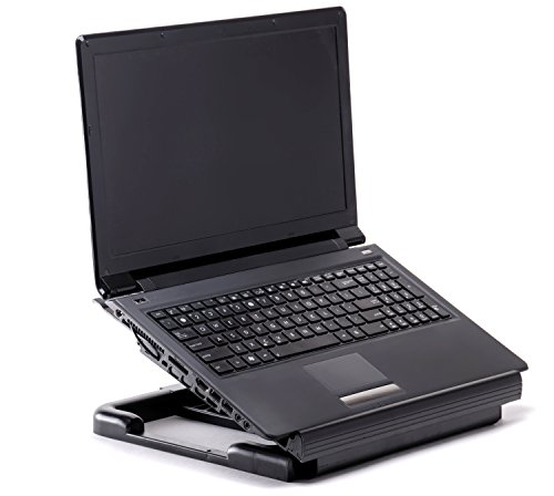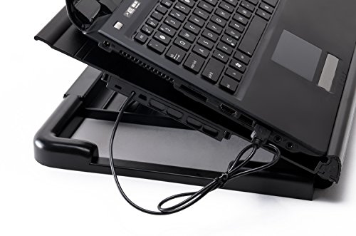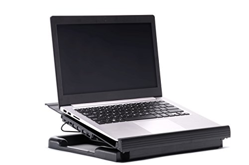 Product Description : Pwr+ Laptop Stand helps reduce the operating temperature of your laptop and allows for steady airflow around it. It uses active cooling methods to distribute air quietly and evenly under the base of your laptop or netbook. Powered by your laptop's USB port (usb cord is included), two silent fans use so little energy that it won't even have any impact on the battery life. Wherever it is used - be it a desk, sofa or your lap - Pwr+ stand provides a most comfortable typing angle and reduces neck and shoulder stress thanks to its unique design and shape. Nine adjustable height, unique raise and lock stand mechanism provides ample clearance and air flow beneath the stand even when used on top of thick blankets.