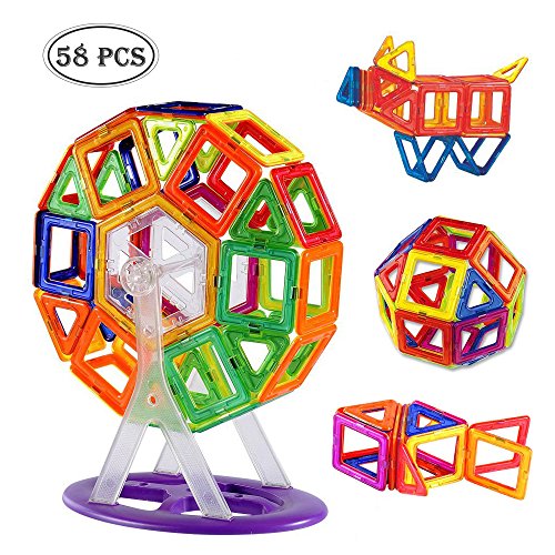 -. Feature : 【58 pcs Mini Magnetic Set】Including 8 x Ferris wheel bracket, 24 x Square, 12 x Triangle, 2 x Hexagon, 12 x Cards. 2 different random colors on each side of each magnetic tile. / 【Safe Material】The Magnetic Building Blocks is made from non-toxic ,High quality Imported PC material conform to CE, ASTM and EN74.Smooth edge of each tile without sharpness will never hurt baby's little hands. / 【Intelligence Development】Magnetic building blocks helps to open a door for kids imagination, creativity and coordination, entertaining and educational for your kids, great for brain development. / 【Easy Clean Up】Can be washed by water and mild soap due to its ABS materials, When cleaned up, every piece connects to another and neatly stack benefitting cleaning and compact storage. / 【100% Satisfaction Guaranteed】Strictly quality control for each item before shipping, please reassured product quality, 30 day no hassle money back guarantee and 1 year warranty.