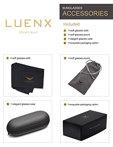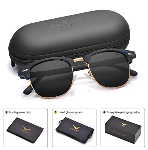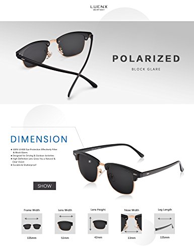 -. Feature : ★POLARIZED LENSES ▶ LUENX polarized lenses filter out scattered and reflected light to minimize glare while further enhancing contrast and your ability to perceive color. This stands to improve comfort by reducing strain on your eyes-even during the brightest days of summer. For those searching for additional style,non-mirrored lenses provide an appearance that's both bold and timeless. / ★LIGHT-WEIGHT FRAME DESIGN ▶ The exterior of our frames provides a clean, streamlined appearance while on the frame's interior sides, we've reduced the material used in areas subject to minimal stress and reinforced target areas for maximum durability. This significantly reduces the weight of our frames, and allows them to be extremely thin and flexible. / ★HIGH QUALITY ARM ▶Armed with a timeless style, the LUENX is at ease on the peaks and in the streets. Its Clubmaster design features accents on the front of the frame and lenses with a base three curve, which provide a flatter look. / ★SKIN-FRIENDLY NOSE PADS ▶ Environmental & skin-friendly materials.Elastic and weight-free features enables you a long-time wearing without fatigue. / ★30 DAY MONEY FREE BACK GUARANTEE ▶ Solid customer service and 100% satisfaction guaranteed,First Choice as A Gift.Unisex.Clubmaster Style.Good for Driving & All Out Door Activities for all Day;Limited Time Special Pricing and Elegant Glasses Accessories for Free, Get LUENX'S Sunglasses Now;
