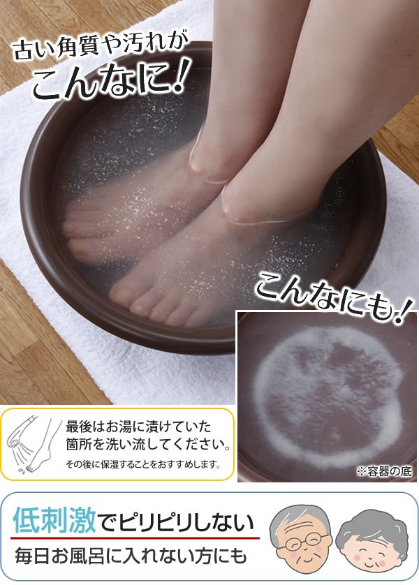 | 溶かしたお湯に手や足を浸け軽くこすると、不要な角質や溜まった汚れがフワーッと浮き出る!手軽に使える、新感覚の角質ケア用品。角質/足/手/足裏/かかと/ガサガサ/ニオイ/すべすべ/つるつる/清潔/足浴/足湯/手浴/手湯/フット/ハンド/バス/ボディ/ケア/入浴剤/低刺激/自然派/やさしい |