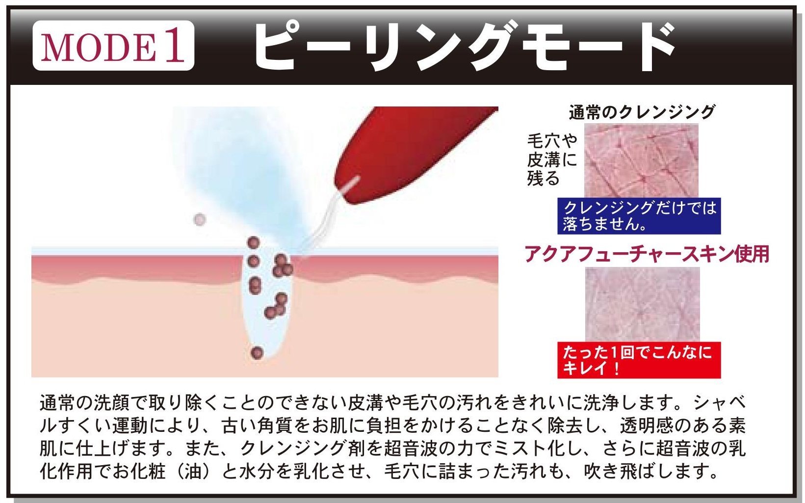 "Aqua Future Skin" is an ultrasonic facial beauty facility which can easily do water peeling at home to remove old horny and dirty pores.
