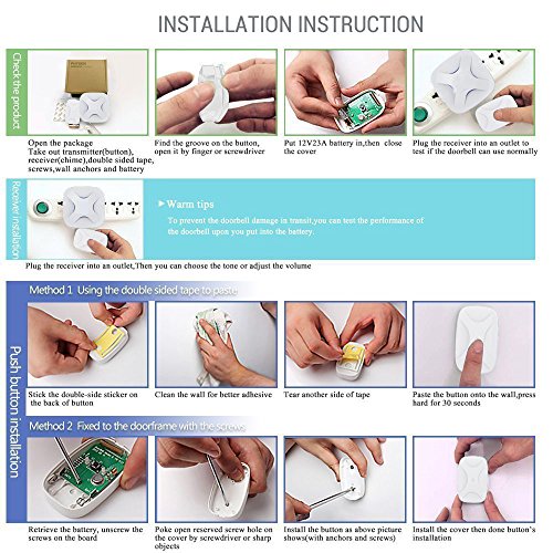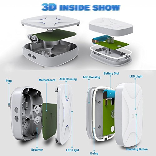 -. Feature : Touch Sensor Function - Unique Premium Touch sensor operating doorbell. No buttons. Touch to operate the doorbell. Stylish and Modern design, in classic white and now with a WATERPROOF remote transmitter button.Suitable for home, apartment, office, etc. Can also be used as calling device for elderly to alarm their caregivers. / Operating Range of over 500 feet. (1000 feet in open area). Remote transmitter button is WATERPROOF and usable in extreme indoor and outdoor wet water conditions. / 52 different Chime tones. Four levels of adjustable volume from 25dB to 110dB. / Easily Plug Receiver into an electrical outlet (no batteries required for main receiver). CE, FCC, RoHS certified. NO pairing is required as pre-configuration had been done on the doorbell. / Includes 2 Plug-in Receivers and 1 Remote Transmitter, double sided sticker, screws, and battery for remote transmitter. CUSTOMER SATISFICATION GUARANTEE - ONE YEAR WARRANTY