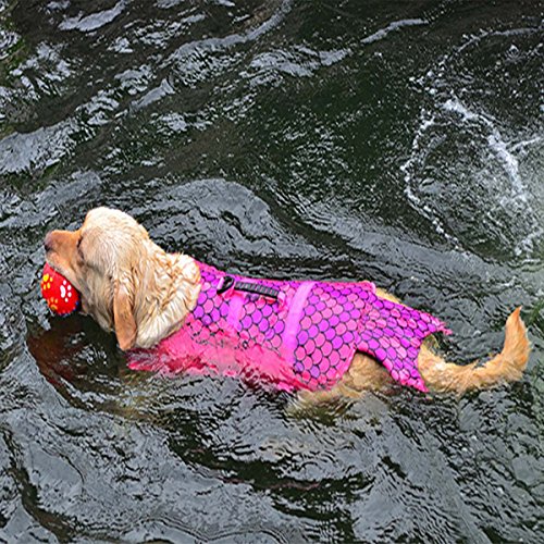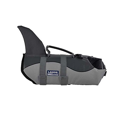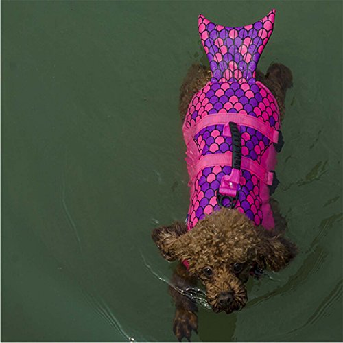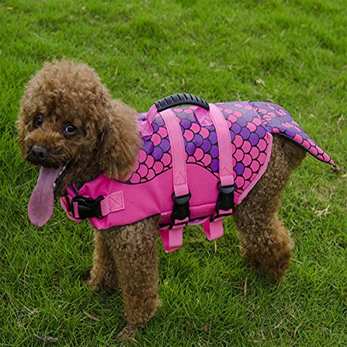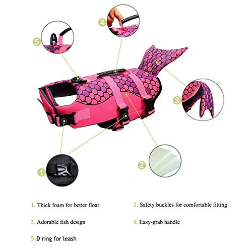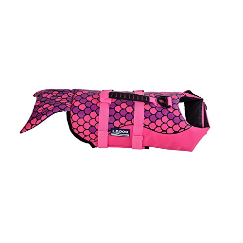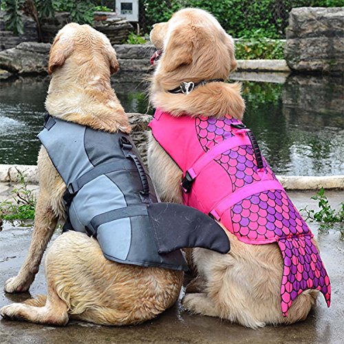 -. Feature : Function & Safety: LANDGOO dog life jacket is the ultimate in canine flotation and water safety for dogs that love to join their humans rafting, kayaking, boating, surfing and paddle boarding. / Easy-Grab Handles make getting your dog in and out of the water easier by hand, provides better night time safety. The Hook & Loop can protect the dogs from straps going around their chest to prevent sore spots from rubbing. / High Grade Material: Thicker materials, better stitching and higher quality leash loops provide a better life jacket for your dog. Made with two layers of flotation material, the oxford nylon fabric is rip stop and allows for quick drying and proper drainage. / Reflective Detail: Removable front float assists in keeping pup's head above water. Reflective stripes/adjustable belt & quick-release buckles design for comfortable and secure fit. The Heavy-duty D-ring Hook is perfect for dog leash. / Colors: Extra Bright Safety Colors enhanced visibility in or out of the water at night or in dark places. Shark or Mermaid Patterns will make your pup look stylish.