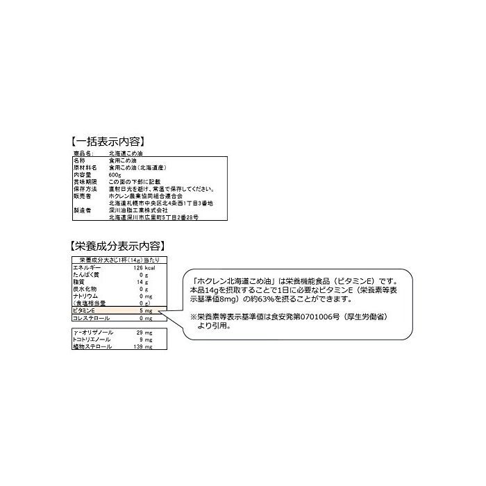 원본상품명: ホクレン 北海道こめ油 600g