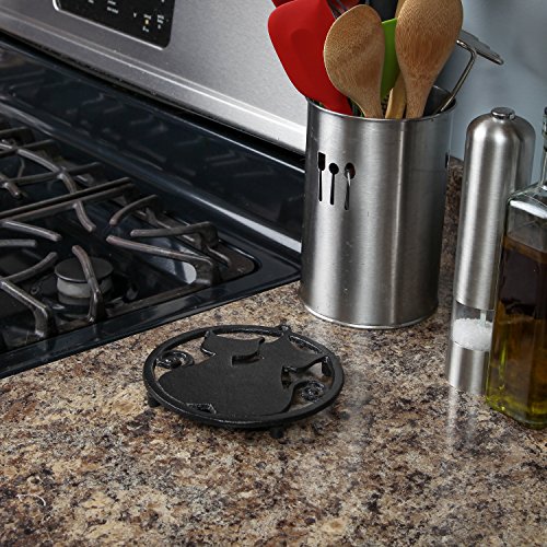Studio : Home-X Publisher : Home-X Product Description Not only can do these cat trivets protect counter-tops or furniture, but they also make fanciful accents for a table, bookshelf or wall. Durable cast iron trivet with non-scratch rubber feet protects surfaces from direct heat. Great for granite and quartz counters, wood kitchen and dining table. Sturdy heat safe trivets support hot pots, pans, heavy pressure cooker, dishes, bowls and plates. Group a three or four together to use for larger platters, dutch oven, or soup tureens. Makes a "purr"fect gift for a wedding, house warming, bridal shower, birthday, Mother's Day or Christmas. Use these versatile cast iron cat trivets as drink coasters, under plants, or as wall decor. Compliments most home decors including country, vintage, or modern. Hand clean with a damp cloth and towel dry. Available in three styles: Cat Face. Measures about 6.5" x 6" x 0.75". Round trivet with two cat silhouettes. Measures about 6" diameter by 0.75". Includes loop hole at top for wall hanging. Square Trivet with Single Cat in Window. Measures about 6.25" x 6.25" x 0.75: 0