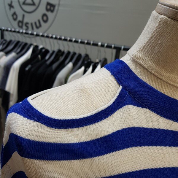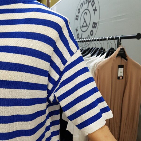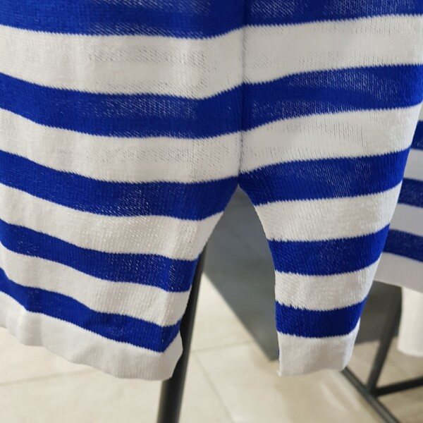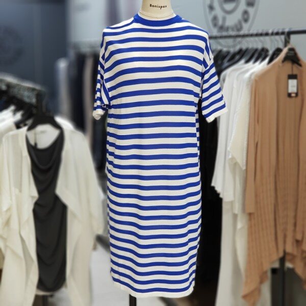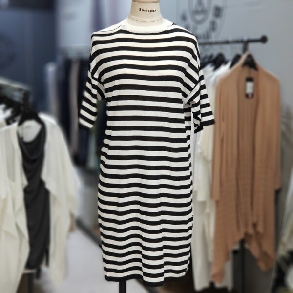 세련되고 산뜻한 스트라이프 패턴의 언발란스한 어깨트임이 포인트인 니트원피스입니다.여성스럽고 깔끔한 분위기 연출해 보세요~~레이온 65%가슴단면 47cm총장 89cm