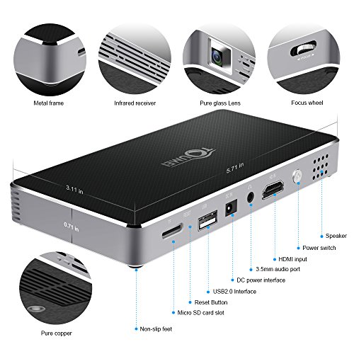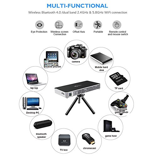 Studio : TouMei Publisher : TouMei Binding : Electronics Product Description Upgrade happycast of portable projector Happycast latest version:6.6.1.9 Open Happycast it will automatically detect and prompt version upgrade, select the update. Manually upgrade, in the home page,use up button on the remote control to enter the menu, choose the settings to select the version update. Connect android phone to portable projector 1:Android device and the portable Projector are connect with same WIFI. 2:Open wifi display in portable projector(Samsung phone open happycast app in portable projector,the phone Scan the QR code install happycast),select setting to set the device name. 3:Open the Android Multi-Screen,search for equipment and choose to connect the device. 4:The mini projection screen pops up the Android device,choose to accept,and then the Android device and the projector to achieve the connection. Connect iPhone and ipad to portable projector 1:iPhone and the portable projector are connected to the same WIFI. 2:Open happycast app in the portable projector. 3:Open Airplay Mirroring in iPhone to search equipment,click to achieve iPhone large screen delivery. 4:Close Airplay Mirroring to disconnect. Connect the portable projector's Bluetooth 1:Open the setting center in the portable projector 2:Search bluetooth devices(likes audio equipment, headphones, ect.),click to achieve sound output 3:Close bluetooth to disconnect Specifications Lamo:OSRAM LED lamo Lamp life: 30000 hours WIFI: 2.4G/5G Dual-band WIFI USB: USB HOST 2.0 TF Card: Maximum supported 32G HDMI: HDMI input Bluetooth: BT 4.0 (Support external Bluetooth Speaker, mouse Brightness: Real DLP 100 anls lumens DDR: 1GB DDR3 Memory:8GB CPU: Quad-Core ARM Cortex-A7 with up to 1.2GHz List 1 x Portable Projector 1 x Remote Controller 1 x Power Adapter 1 x USB cable 1 x Tripod 1 x User Manual 0