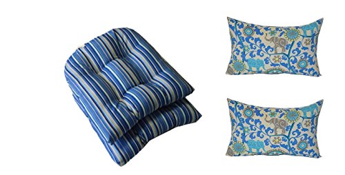 -. Title : Set of 2 - Indoor / Outdoor Sapphire Blue, Tan Stripe Tufted U-shape Cushions for Wicker Chair Seats + 2 Free Sapphire Blue, Turquoise, Green, Gray Bohemian Elephant Lumbar Pillows