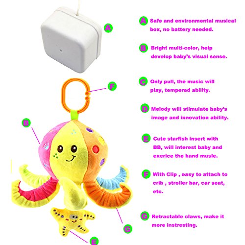 -. Feature : With Clip/String easy to attach to stroller, crib,car seat, gym, etc. Also a great comforter sleep doll. / Pull down For musical(Twinkle, Twinkle Little Star,lats about 60s secound), develop baby's motor skills.No batteries needed. / Multi fabric,geometric figures and bright colors,help develop baby's cognitive skills, visual sense,touch sense,etc. / Super soft fabirc and quality PP cotton.Safe and healthy. / Great Gift for Boys Girls newborn-36 months.