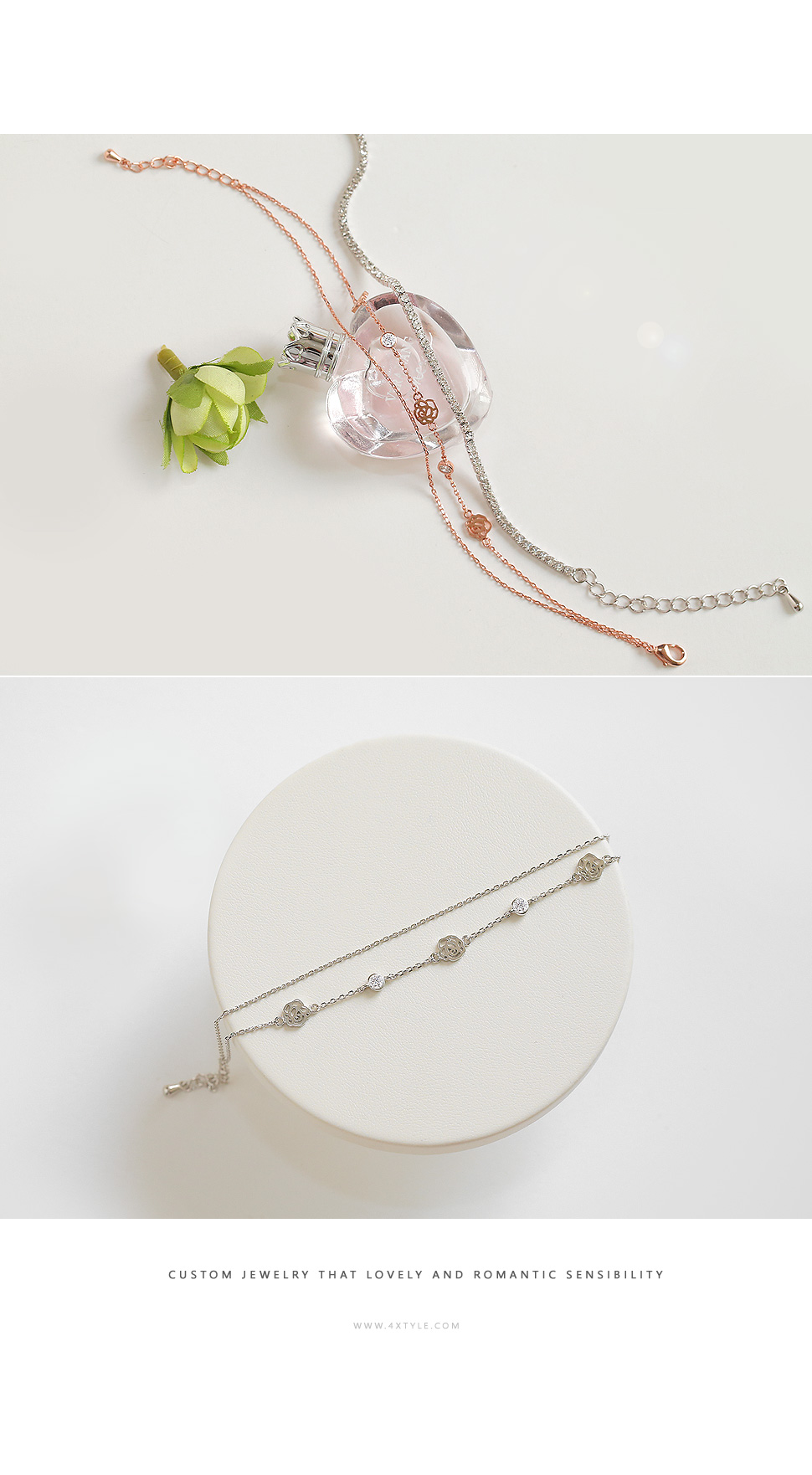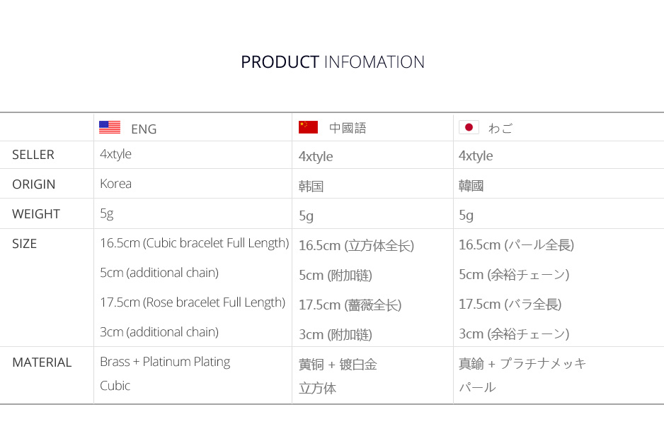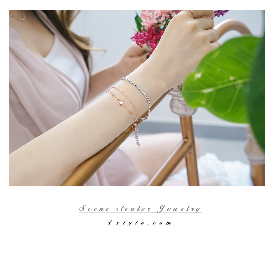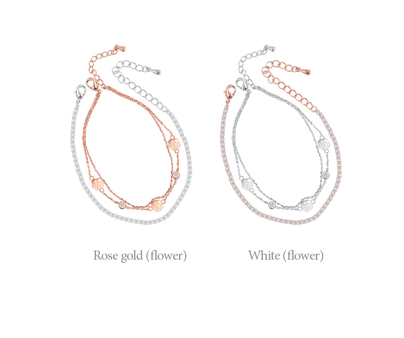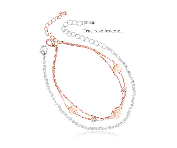 여유체인으로 사이즈 조절이 가능해 실용적인 아이템. 블링블링 화사한 큐빅팔찌와 러블리한 장미팔찌가 한세트로 구성된 제품.