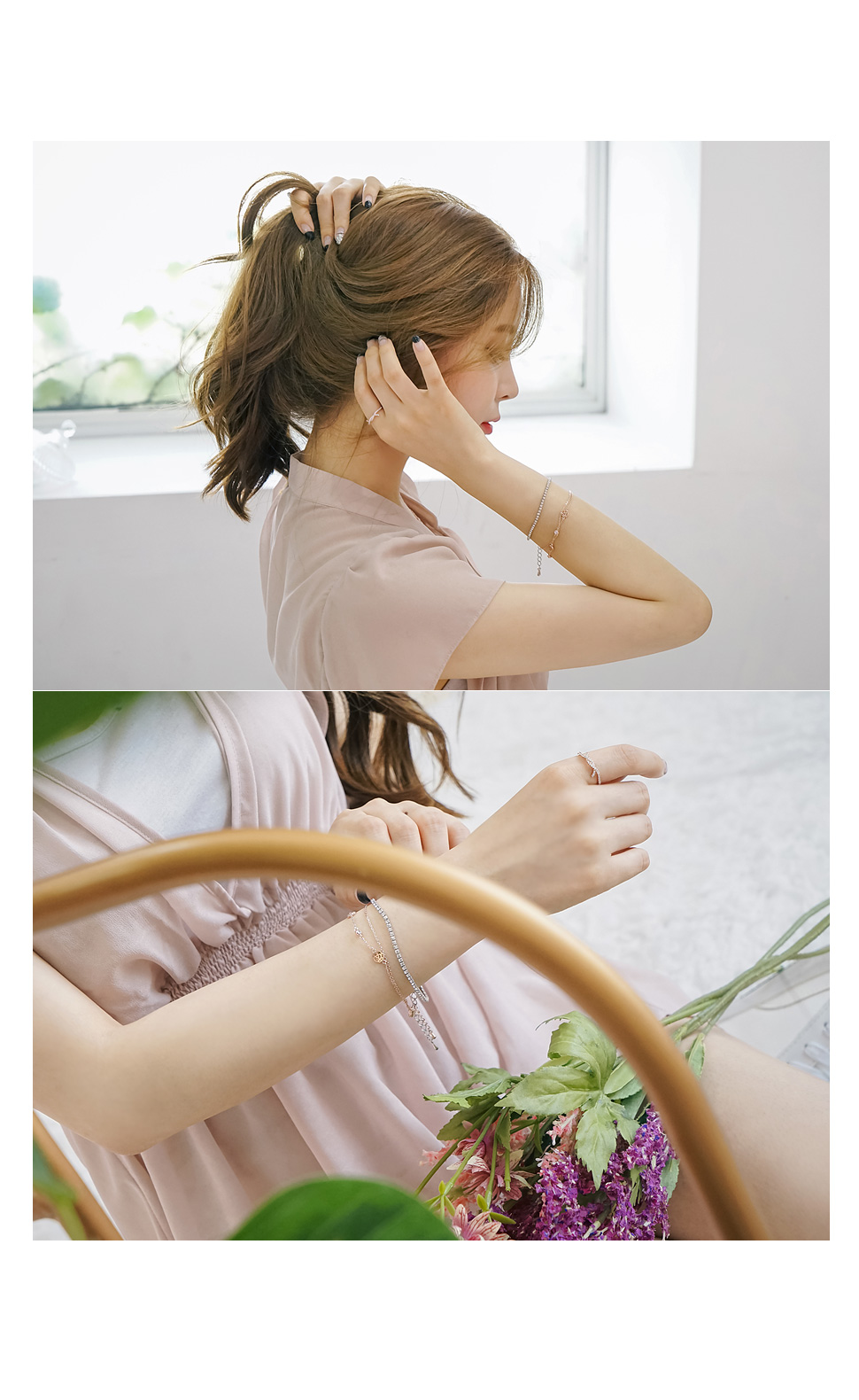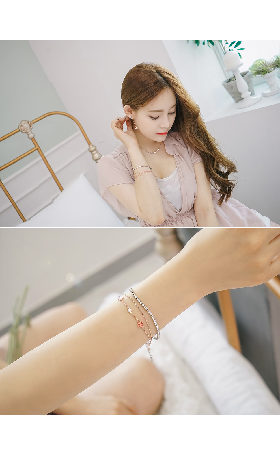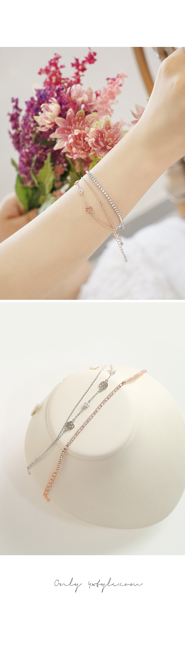 두줄을 레이어드한듯한 장미팔찌와 심플한 큐빅팔찌는