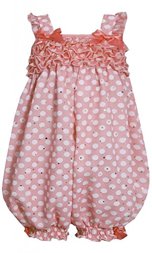 Beautiful baby girl coral-orange and white dot print chiffon romper with foil dot accents and ruffle trim. Machine wash. Imported. Of polyester; Exclusive of trim/decoration. Matching/Coordinating sister styles available in sizes 3M-6X, reference style BNJ-20194R. Needed size not available/sold-out? Find similar styles, search for: bnj-infant-and-toddler-rompersFeature