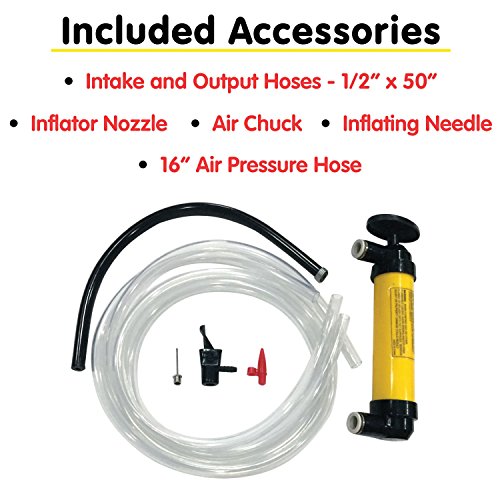 - Included Accessories: 2 pcs., 1/2 in. (12mm) Dia. x 50" (127cm) long Intake and Output Hoses, 16 in. (40cm) Air Pressure Hose, Air Chuck, Inflator Nozzle, Inflating Needle
