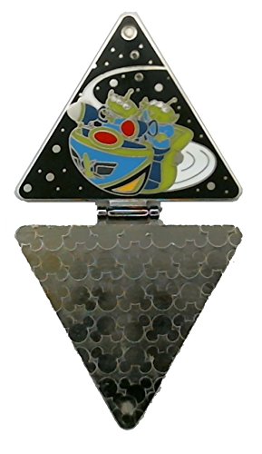 pin is triangular shaped with a hinge that opens downward to reveal two of the green space aliens in one of the vehicles in the ride Buzz Lightyear's Space Ranger Spin