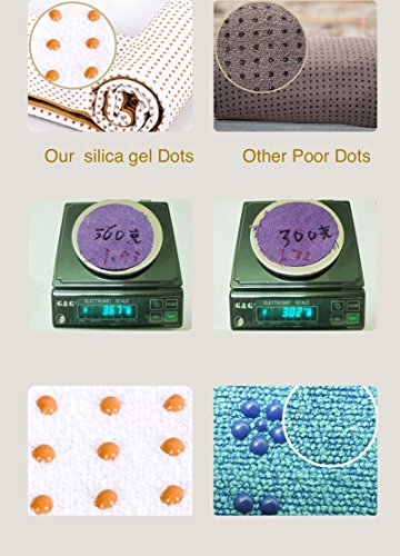 Feature : Patented Skidless technology for non-slip performance / 100% silicone dots grip and keep towel in place on your mat, floor, or carpet / Each towel is made using 8 recycled plastic bottles / All dyes are AZO, lead, and heavy-metal free / Supremely sustainable, soft, hygienic, and absorbent