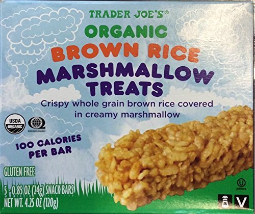 -. Feature : Trader Joe's Organic Brown Rice Marshmallow Treats 5 Bars (4 Count) / Crispy whole grain brown rice covered in creamy marshmallow. / 100 calories per bar, Gluten Free, Low Sodiu, Vegan. / 5-0.85 Oz (24g) Snack Bars / Net Wt. 4.25 Oz (120g)