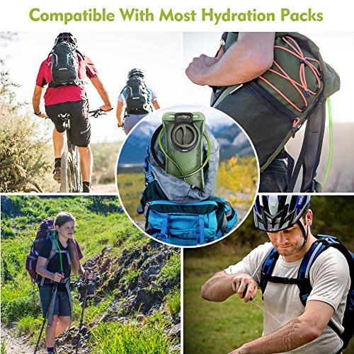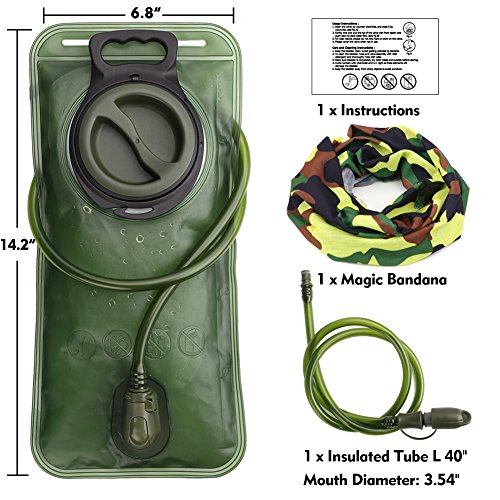 -. Feature : LARGE OPENING FOR EASY CLEANING & FILLING - Our hydration bladder has one of the largest opening on the market. The big opening makes for easy pouring of water. It is also fairly wide for a hand or bottle brush easily access to the interior hydration bladder. The 4" screw on cap goes on and off easily. For cold water, simply add ice cubes directly from a scoop or refrigerator ice dispenser. Smoothness of the liner prevents germ and lime from adhesion, which promotes health and easy to clean. / PREMIUM QUALITY - The whole hydration bladder is made of premium anti-bacteria material. Taste free, non-toxic, BPA free, SGS and FDA certified. This tested to comply with international safety standards. It won't leave a bad taste in your drink. The water bladder passed pneumatic pressure test, it is pressure-tolerant. Double sealing side technique has greatly improved durablity. Might be the most rigid hydration bladder on the market. / REMAIN PEFECTLY HYDRATED - This 2L water reservoir can withstand temperatures from -20 to 50 degrees celsius. INSULATED TUBE resists temperature changes in hot and cold weathers. L 14.2'' x W 6.8'' Hydration bladder is compatible with most hydration packs. The tube (0.4" diameter, 40" long) provides a wholesome flow for easy drinking, keeping you hydrated when biking, cycling, hiking, or running! / 100% LEAKPROOF - You won't be slowed down with our high flow bite-valve. Simply bite the mouthpiece to suck water. Soft mouthpiece with easily accessible ON/OFF valve prevents leakage. It also has a cover to keep dirt out. Conveniently control the water flow by biting, when not bite, the water will not leak out. Quick-release tube is detachable. Auto shut off while the tube is removed, bladder will stay filled non-leaking. store neatly in fridge/icebox without tangling hose. / GET A FREE ITEM and MONEY BACK GUARANTEE - Upon placing your order, you will get a magic bandana at no additional charge. Your purchase is backed by our 100% REFUND PROMISE. If you are not absolutely happy with your purchase of the hydration bladder for any reason, simply send it back for a full refund or to get a new replacement. No questions asked!