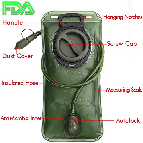 -. Title : Hydration Bladder 2 Liter Leak Proof Water Reservoir, Military Water Storage Bladder Bag, BPA Free Hydration Pack Replacement, for Hiking Biking Climbing Cycling Running, Large Opening, Insulated Tube