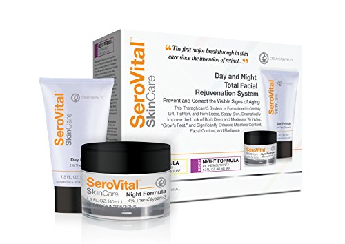 THE PROBLEM Did you know sugar can age your skin... maybe even faster than the sun? That's right. Sugar causes wrinkles through a process called glycation, creating Advanced Glycation End products (AGEs) that can make collagen and elastin proteins malformed, weak, and discolored. This leads to wrinkles, sagging, and dull, old-looking skin. You can try to avoid sugar, but unfortunately it is present in almost everything we consume these days. It's present in the food you eat and in the beverages you drink. Even "healthy" products like diet drinks and protein bars contain more sugar than you'd expect. So what's a body to do? THE REVOLUTIONARY SEROVITAL SKINCARE SYSTEM SeroVital Day and Night Total Facial Rejuvenation System is so much more than just a wrinkle cream. The Theraglycan-3 compound has been tested on human skin and shown to make it appear measurably younger... 8-10 years younger, to be exact. EVEN MORE IMPRESSIVE But that's not all. The Day and Night Total Facial Rejuvenation System also contains amino acid complexes and "anti-aging" bioactives that have been tested on real people in a real-life setting and been clinically validated to not only reduce the look of fine lines, deep wrinkles, and crow's feet, but to improve the appearance of age spots, loose, droopy, flaccid skin, and - most importantly - make everyone's complexion look healthier, more radiant, and significantly younger. THE DAY AND NIGHT SYSTEM SeroVital's Day and Night Total Facial Rejuvenation System is a complete skin-care regimen. There are two aspects of this regimen. DAY CREAM A quick-absorbing, light-textured cream (makes an excellent base for applying makeup!) NIGHT CREAM< A highly concentrated cream for powerful overnight effectiveness.Feature