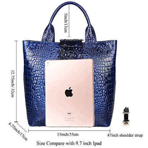 -. Feature : 100% Leather: Embossed Crocodile Leather; Lining Fabric / L 13" x H 12.75" x W 6.75", handle height: 5", 47" Shoulder Strap Drop, Weight: 1.13KG / Zipper opening up to a large storage,Accented with a convenient leather belt strap. A large zip close middle pocket for separation and storage, two open pockets on one side and 1 zipper pockets on the other side for storage. / Magnet & Top Zip Closure