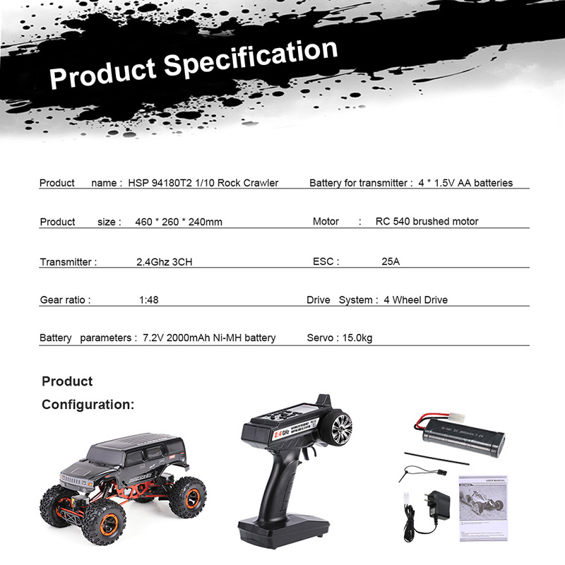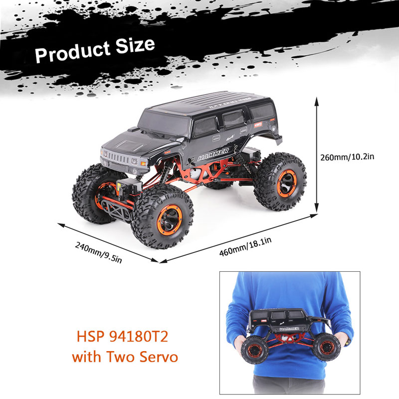 The original HSP 94180T2 1/10 4WD electronic powered brushed motor rock crawler you will ever find, with all the options you will ever need. It is now available completely ready to run. Just go enjoying the fun!