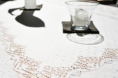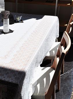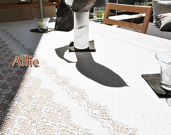 レースのジャガード柄がとても繊細で高級感漂うテーブルクロス。どんなインテリアにも合うオフホワイトカラー。撥水加工も施してあり、お手入れも簡単です。定番で常に人気の高いテーブルクロスです!
