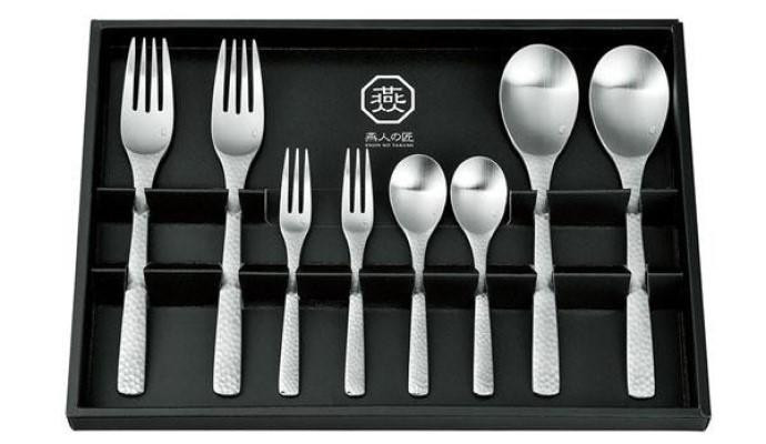 職人の手によって丹念に掘り込まれた美しい鎚目が柄の紋様として転写された重厚感のあるカトラリーセットです。